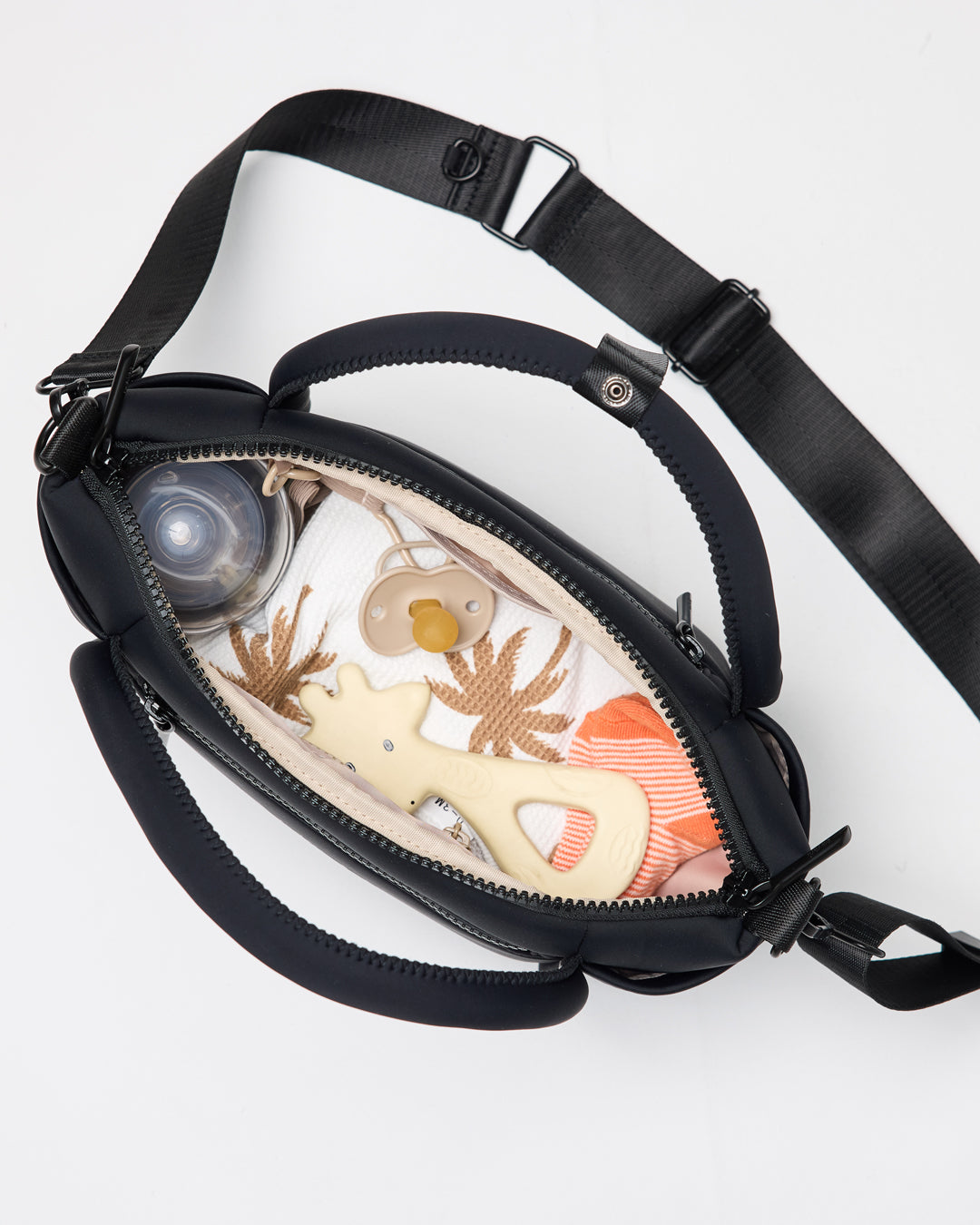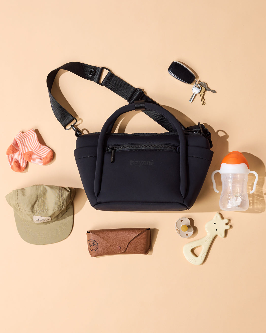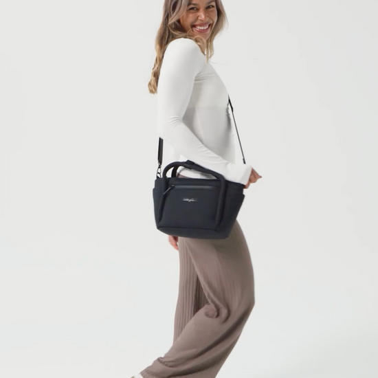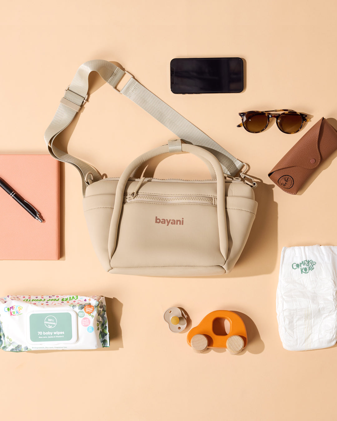 one bag, two ways - the bayani pram caddy transforms from stroller organizer to crossbody bag so you can keep hands-free, organized, and on the go.